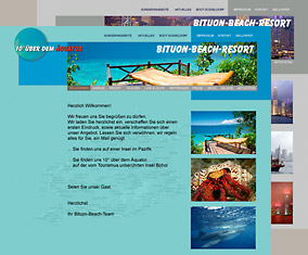 Ein nobles Tauchresort auf den Philippinen. Durch den Einsatz von guten Fotos und gezielten Informationen wird hier dem Besucher ein Eindruck vermittelt von dem was Ihn vor Ort erwartet. Ein Kontakt findet über die Site durch einen Newsletter und eine Referenzseite statt, in der Jeder in Wort und Bild seinen Besuch im Resort schildern kann. |  |